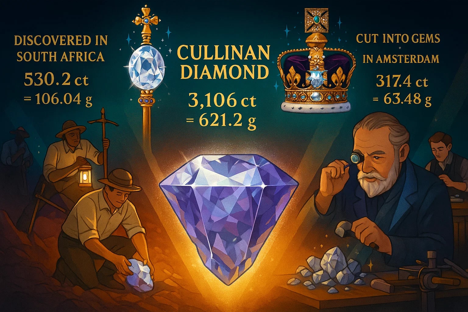 In 1905, at the Premier Mine in South Africa, miners discovered what would become the most famous gemstone in history — the Cullinan Diamond. In its rough form, it weighed a staggering 3 106 ct, equal to 621.2 g. That’s heavier than a loaf of bread, but sparkling beyond imagination.