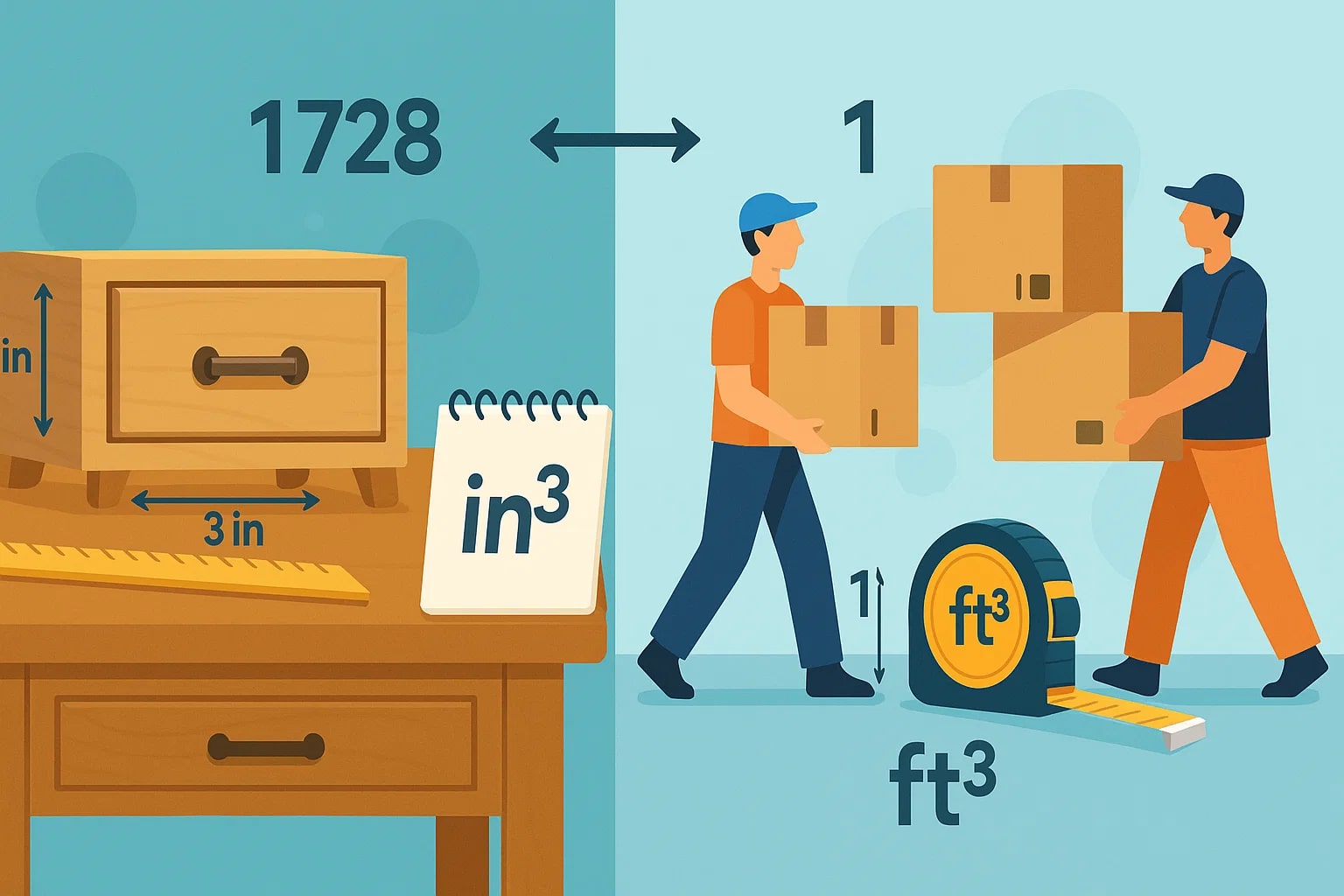 The formula 1 ft³ = 1728 in³ brings together everyday design and larger-scale planning. A carpenter might measure drawer handles in cubic inches for precision, while the whole cabinet is measured in cubic feet. Movers calculate box capacity in ft³, yet small household items packed inside are often sold in in³.