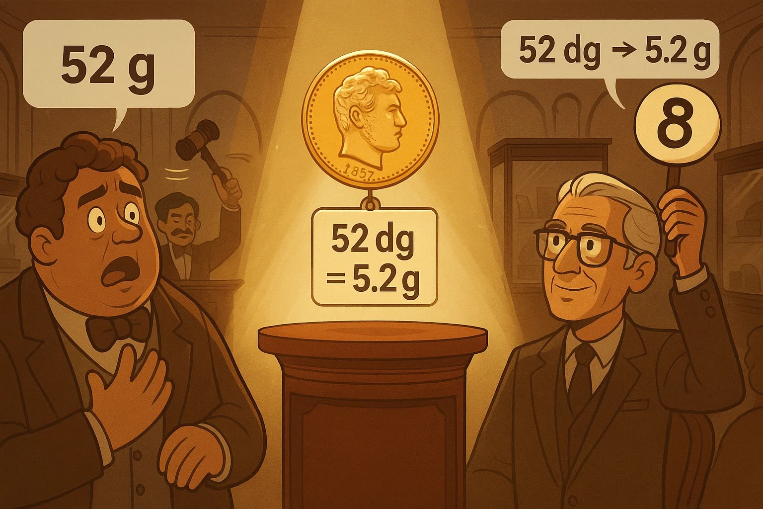 At a prestigious numismatic auction, a rare 19th-century gold coin drew the attention of collectors worldwide. Cataloged at 52 dg, the coin’s description was accurate — but one bidder mistakenly read the listing as 52 g, imagining a much heavier and more valuable piece.