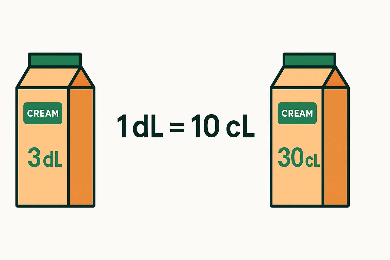 This conversion often appears in everyday life when cooking or pouring drinks. A European cookbook may call for 3 dL of cream, while the carton in your fridge is labeled 30 cL. Both describe the same volume — you just need the conversion to see it clearly.