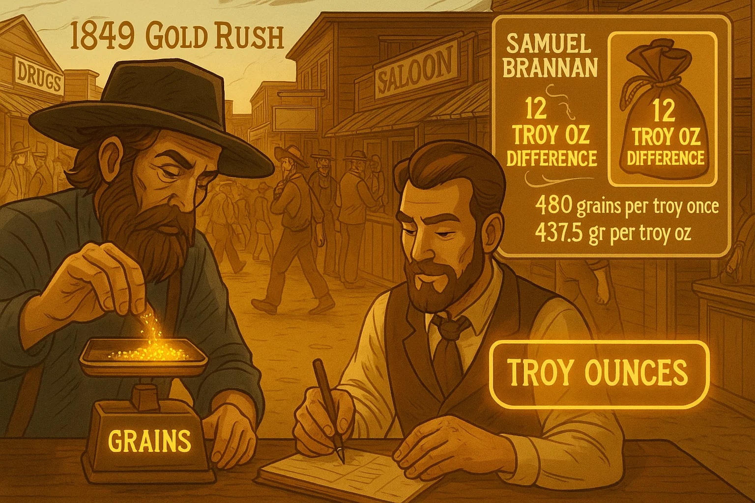A famous account tells of a miner named Samuel Brannan, who nearly lost a large sale when a buyer claimed his pouch weighed 12 troy ounces less than expected. Brannan insisted on checking the figures and discovered the buyer had calculated using the avoirdupois ounce instead of the troy ounce. By correcting the conversion — 480 grains per troy ounce instead of 437.5 — Brannan secured the proper payment, a fortune at the time.
