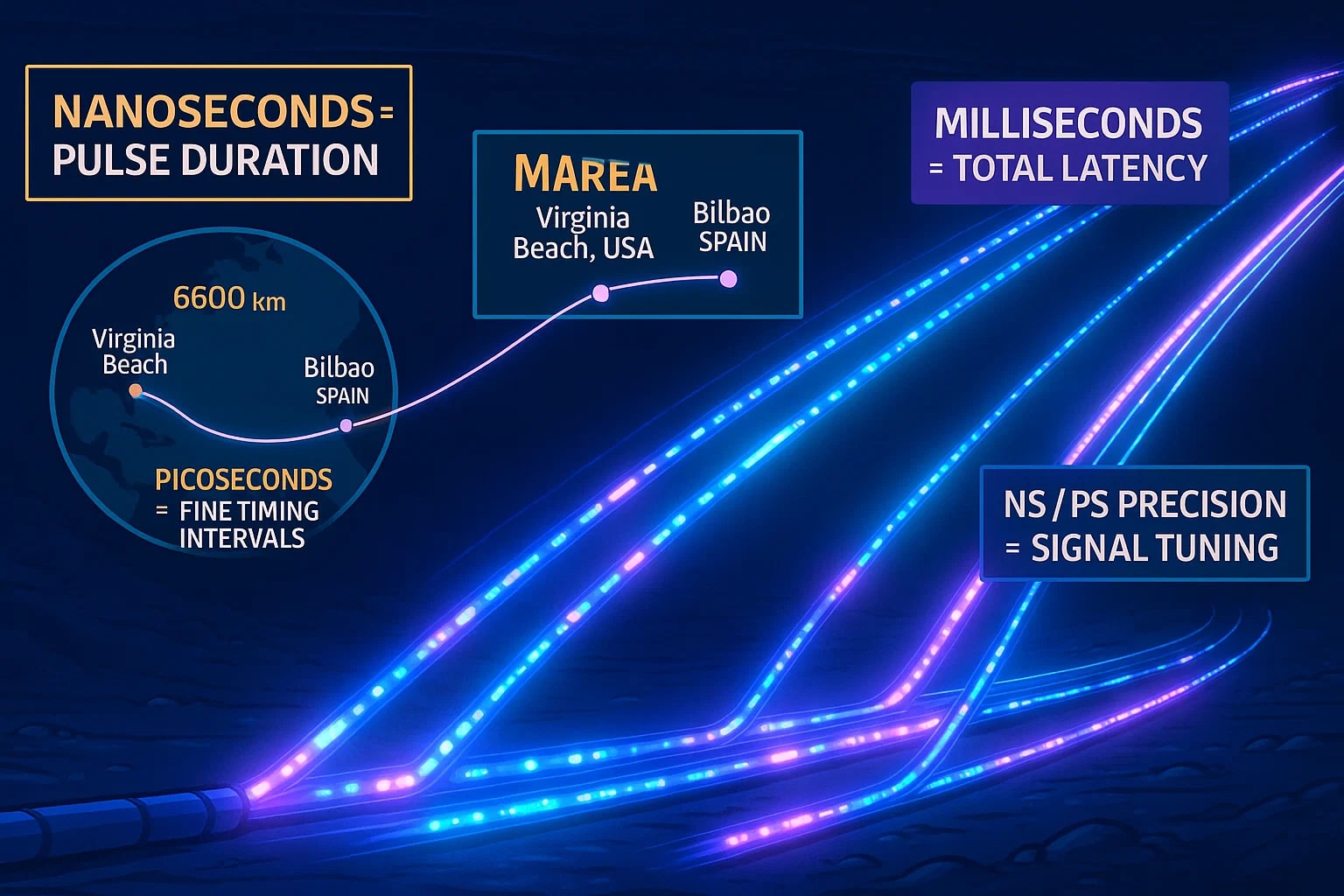 One notable example is the MAREA transatlantic cable between Virginia Beach, USA, and Bilbao, Spain. Spanning over 6,600 kilometers, its system latency is measured in milliseconds for end-to-end travel, but individual signal components are tuned with nanosecond-to-picosecond precision to maximize data flow. Without this fine control, we’d experience slower internet speeds, more dropped calls, and lower streaming quality.