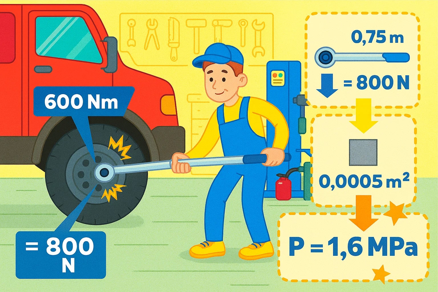 The nut’s contact surface with the wheel stud measures 0.0005 m². Dividing the force by this area gives:P = 800 ÷ 0.0005 = 1 600 000 Pa (1.6 MPa).